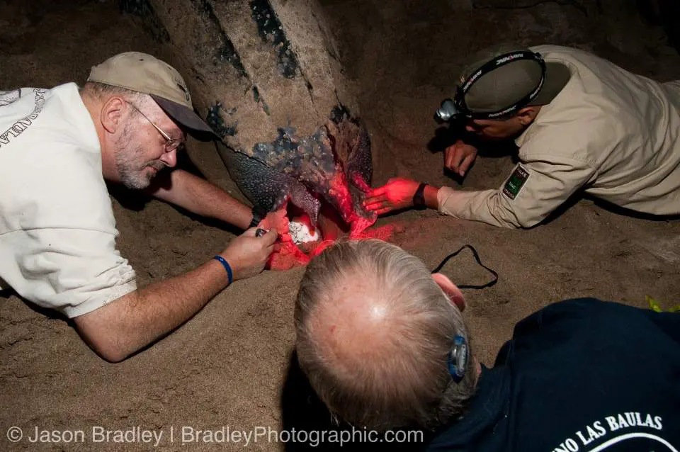Goldring-Gund Marine Biology Station researchers provide nesting turtles with identification tags to measure their reproductive output and determine population size. TLT scientists have tracked the reproductive output of leatherback, olive ridley and black turtles nesting at Playa Grande since 1993. We monitor nests to understand how sea turtle eggs develop and what factors lead to the highest output of healthy hatchlings.