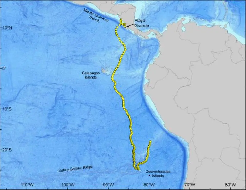 Every once in while a champion turtle fights against all the odds to survive and continue the turtle cycle of life. The map shows the tracks of one such turtle who managed to find enough resources at sea (and that’s a lot of jellyfish) to reproduce and return to Playa Grande for multiple seasons! Over the course of our research she’s made 7 trips to nest on our beaches. She has also managed to successfully avoid interactions with fisheries and other threats at sea. She’s a true survivor!
