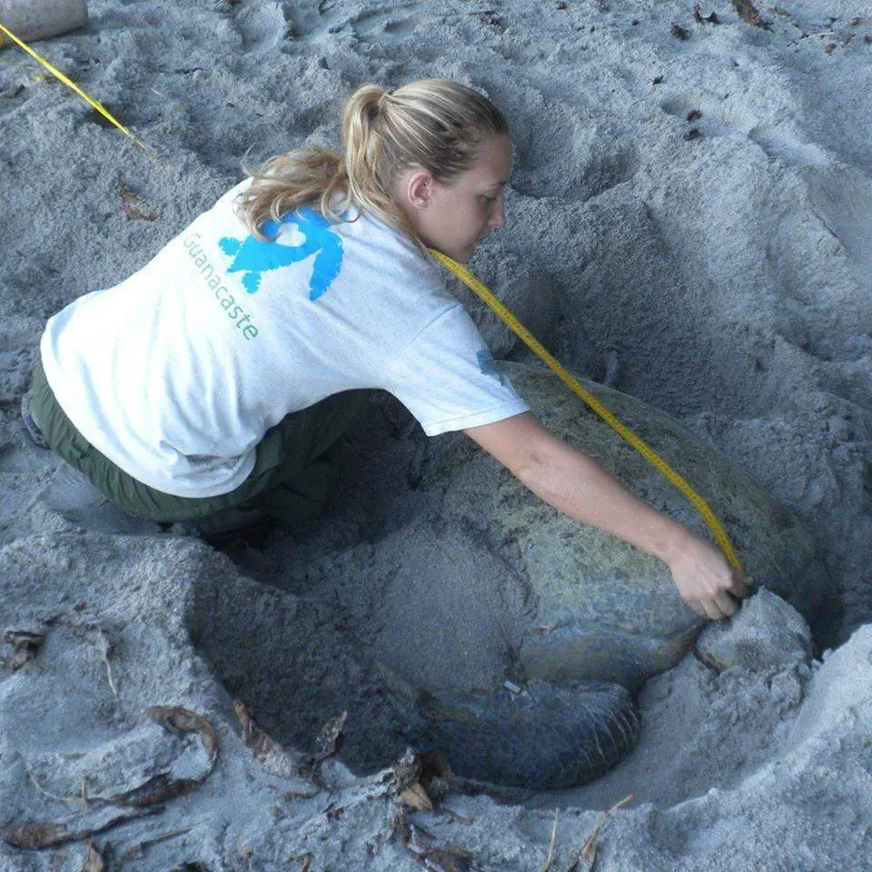 Amber Rhodes measuring a Green turtle nesting on Playa Cabuyal in Costa Rica.