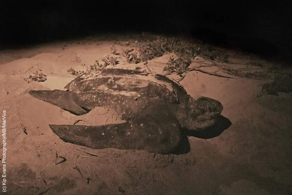 Female leatherbacks usually lay their eggs at night. Nesting turtles may decide not to nest if there are too many lights onshore. Those that come ashore seek nesting sites free of debris (tree limbs). If the turtle does not find a suitable site for her nest, she may return to the ocean without laying.